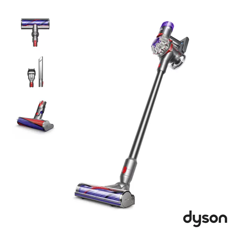 The Dyson V8™ vacuum powerfully sucks up dirt, dust and hair from all floor types. The stiff nylon bristles clean deep into rugs and carpets to remove ground-in dirt and black anti-static carbon fiber filaments extracts dust from hard floors.