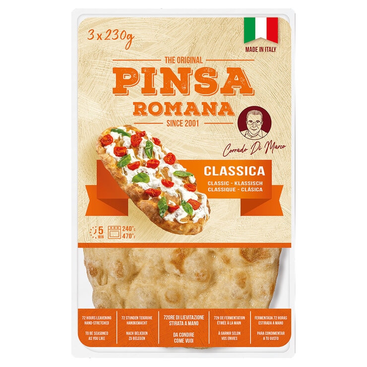 The Original Pinsa Romana is a type of bread that is made by hand-pressing dough into an oval shape. 'Pinsa' comes from the Latin word 'Pinsere' which in the Italian language means to stretch or to spread. It should be crunchy on the outside with a soft and fluffy inside and crafted with artisanal simple ingredients of wheat flour, rice flour, soy flour and dried mother yeast. Pinsa Romana is ideal as a pizza base or dipping bread.
