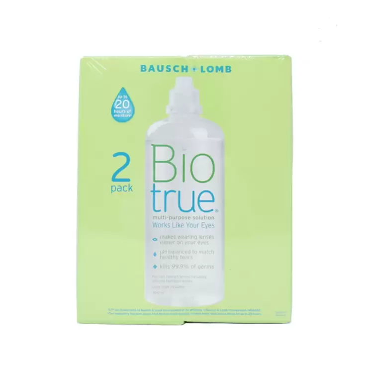The world can be tough on your eyes when you wear contact lenses. Biotrue Multi-Purpose Solution helps make wearing contact lenses easier and is formulated to work like your eyes. Biotrue contains hyaluronan which hydrates your contact lenses in the same way that your eyes naturally hydrate, by utilising a lubricant found in your eyes. Biotrue matches the pH of healthy tears and enables optimal performance of the dual disinfectants. Biotrue keeps proteins in their native state active as they are naturally in your eye. They act as your eye's inborn germ-fighters. Biotrue Multi-Purpose Solution conditions, cleans, removes protein, disinfects, rinses and stores soft contact lenses including silicone hydrogel contact lenses. It cushions and rehydrates lenses for comfortable wear. By keeping lenses hydrated, it makes wearing contact lenses comfortable all day.