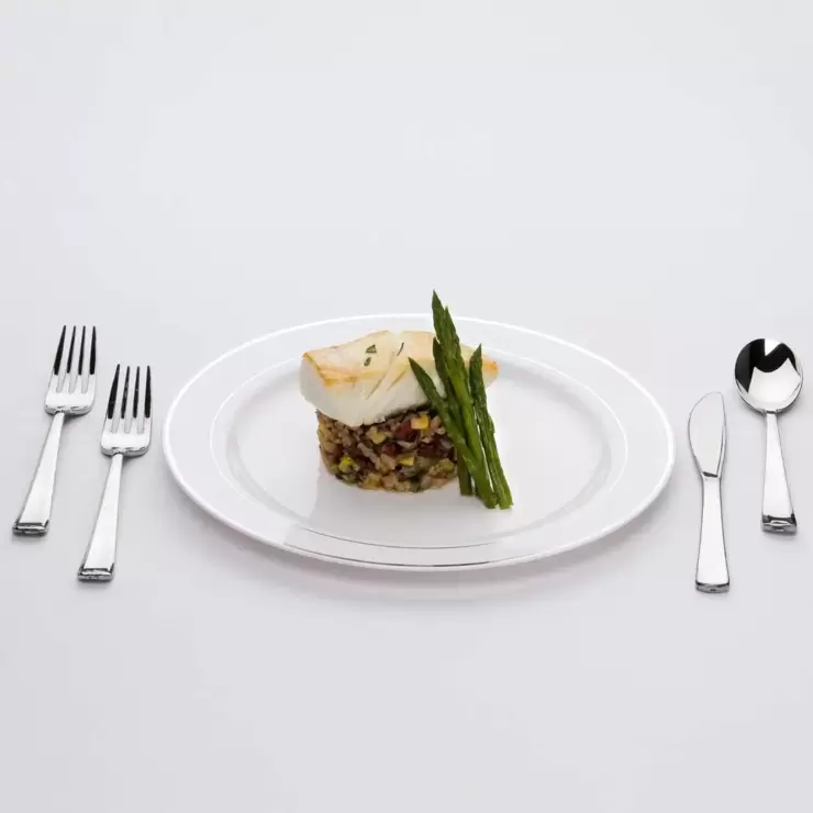 These high quality disposable plates are made of durable heavyweight plastic. Sabert's simple yet stylish white plates with silver rim are great for entertaining family and friends with hot or cold food.