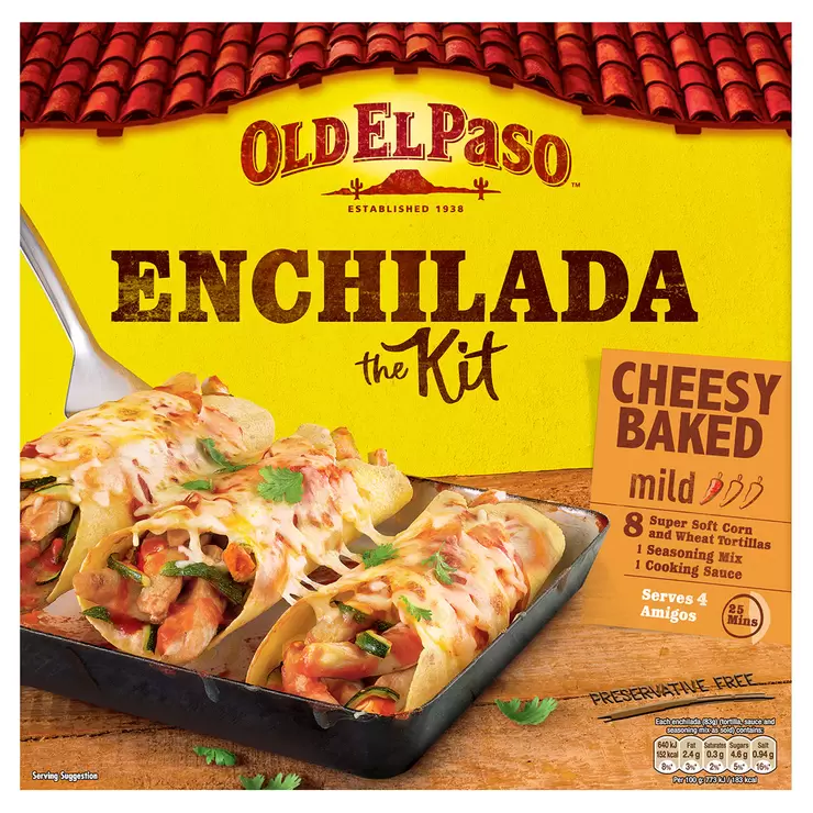 Old El Paso Cheesy Baked Enchilada Kits create the ultimate Mexican meal experience for all the family. Each pack contains 8 soft corn and wheat tortillas, 1 tomato cooking sauce and a seasoning mix. This home-baked cheesy Enchiladas, served golden and bubbling straight from the oven is perfect to enjoy a full-on flavour experience.