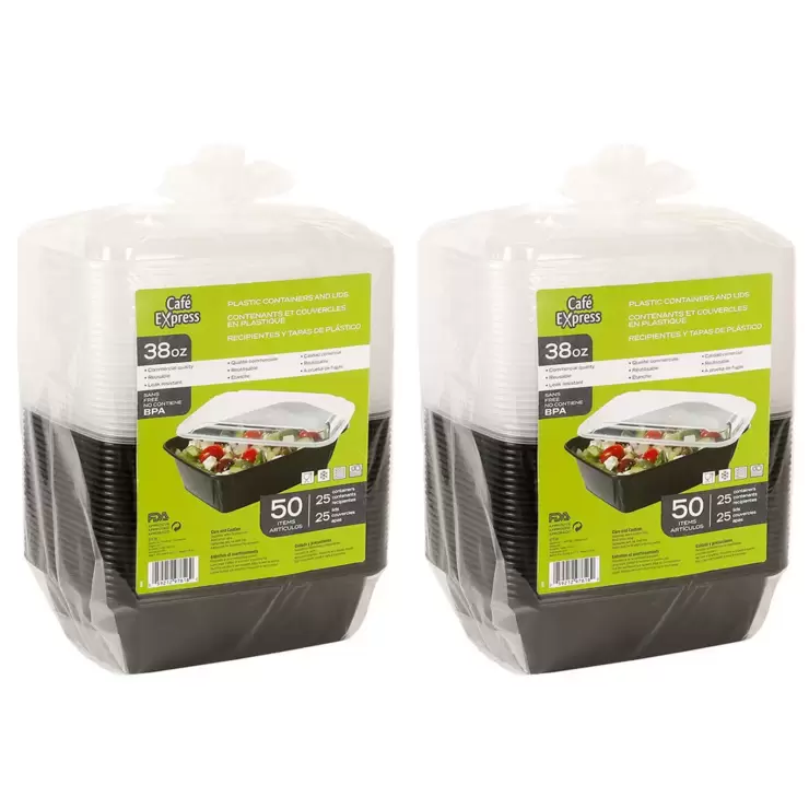 Café Express 38oz Black Plastic Reusable Containers with Clear Lids, 100 Pack