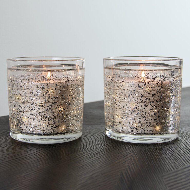 Premium scented candles with integrated LED lights create a captivating atmosphere and ambiance for the senses. The LED lights embedded in the surrounding gel will illuminate when the candle is lit. The lights stay lit while the candle is burning, casting a soft reflection on the metallic glitter. To preserve battery life, store candles out of direct light when not in use. Each candle burns for up to 40 hours. Each candle is 12cm diameter and 12cm height. These candles are made using a premium, responsibly sourced plant wax blend and cotton wicks.