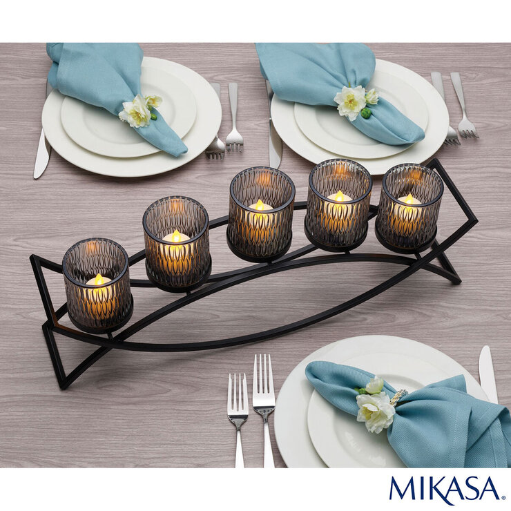 Mikasa Double Arch Centrepiece with 5 Glass Candle Holders adds the allure of ambient candlelight to a table top or mantel. Beautifully crafted of metal, this elegant linear has a curving design and holds 5 glass votive cups within its frame, creating a bridge of light. The striking textured finish of the glass votive cups casts a warm glow when a tea light is placed inside.