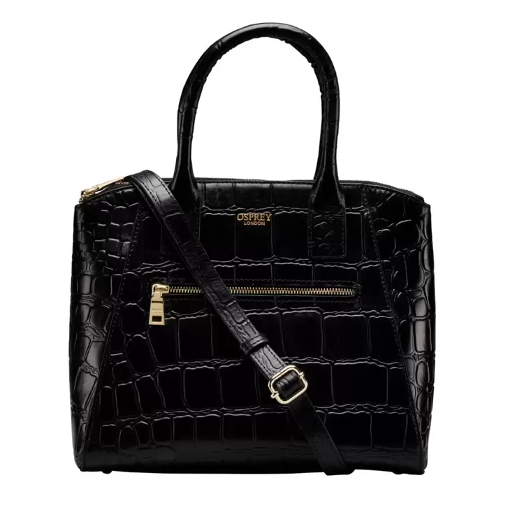 The Osprey London Croc Leather Women's Handbag is handcrafted in calf leather with a croc embossed print and a high shine finish, lined with black jacquard fabric. The bag secures along the top with a zip, featuring a smart Osprey London branded zip-pull. The interior features a pair of slip pockets and a zipped pocket, framed in matching leather with leather zip-pull. The bag offers an alternative to travel hands free with the detachable and adjustable flat leather cross-body strap by simply attaching the strap at the D-rings on each side of the bag.