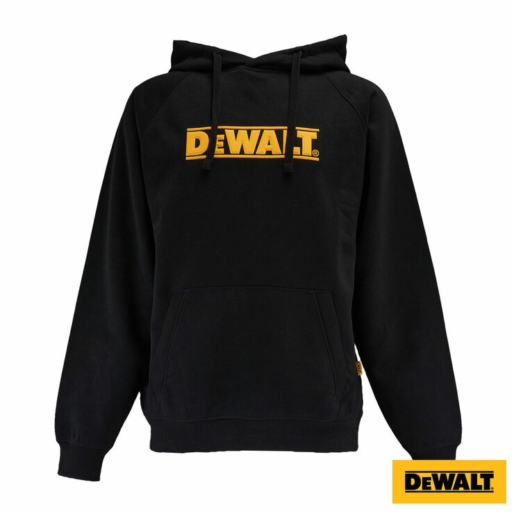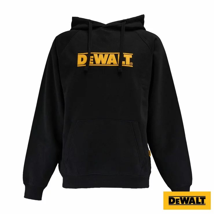 The DeWalt weatherford hoodie is a heavweight garment weighing 380 gsm. The garment has a large chest logo with DeWalt branding as well as a guaranteed tough logo to the right arm along with DeWalt branding on the back below the hooodie itself. The front pocket is a kangaroo pocket and inside you wil find a convenient phone pocket. The garment has a water resistant finish. This is a heavy duty garment for heavy work conditions.
