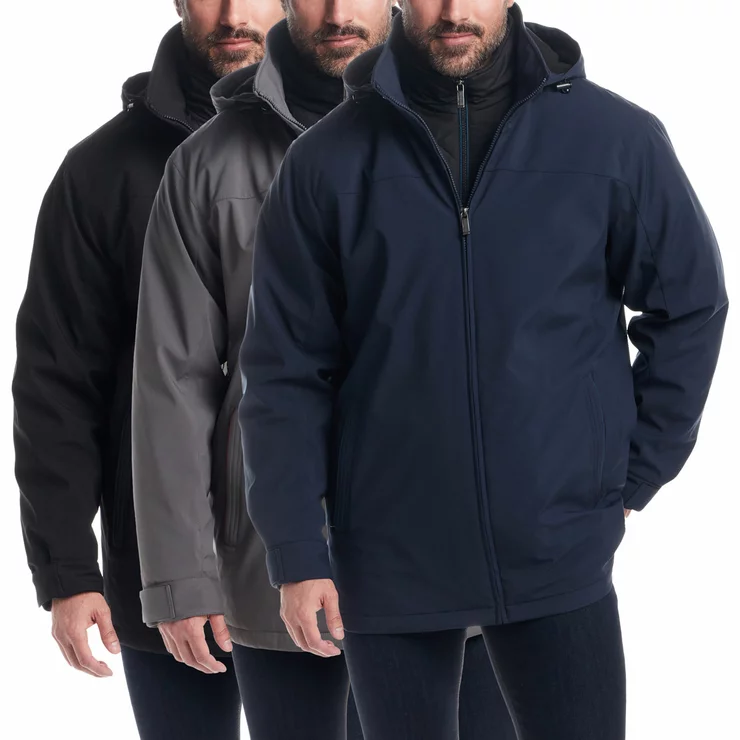 The Weatherproof Men's Ultra Tech Flextech Jacket has a durable and soft double layered bonded shell with 4-way mechanical stretch. It also features a quilted, zip closure interior "bib" for added warmth and protection. The removable hood also helps make this classic jacket perfect for those cold, winter days.