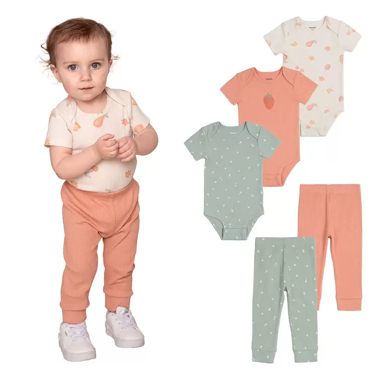 - Each pack contains three rib bodysuits and two rib baby bottoms