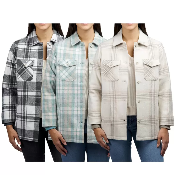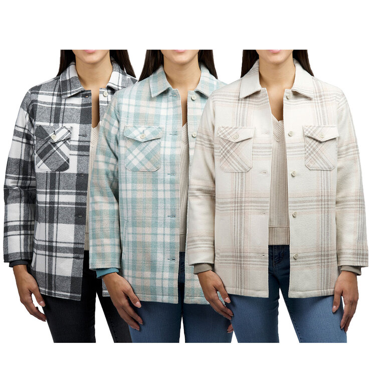 Stay warm in timeless style with this women’s wool blend shacket, designed for both comfort and everyday wear. Available in three classic plaid patterns, it features a button-front closure, two chest pockets, and fleece-lined side pockets to keep your hands cosy.The ribbed cuff sleeves help lock in warmth, while the quilted lining adds an extra layer of insulation without sacrificing style. Perfect for layering, this jacket brings together functionality and fashion for the colder months.