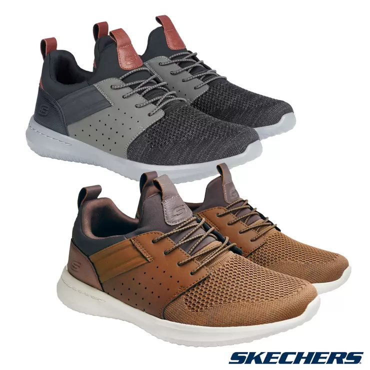 Sport style and lightweight comfort deliver in Skechers Delson - Camben. Lightweight Skech Knit mesh fabric and synthetic upper in a slip-on laced casual with Air-Cooled Memory Foam insole and flexible midsole.