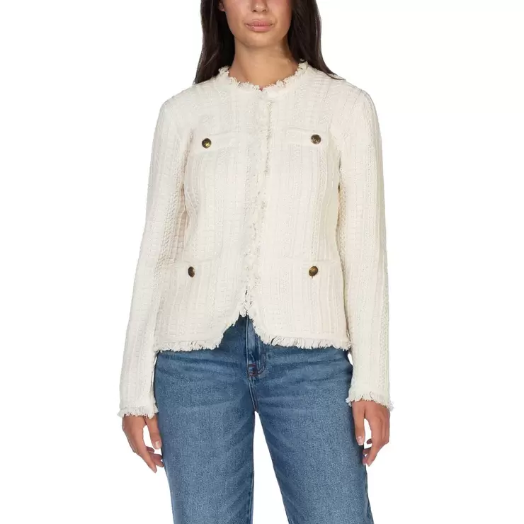 Ladies specialty knit crewneck cardigan with fringe detail. Fabric covered hook and eye closure at centre front. Antique brass buttons. Functional pockets at waist. Decorative pocket at chest.