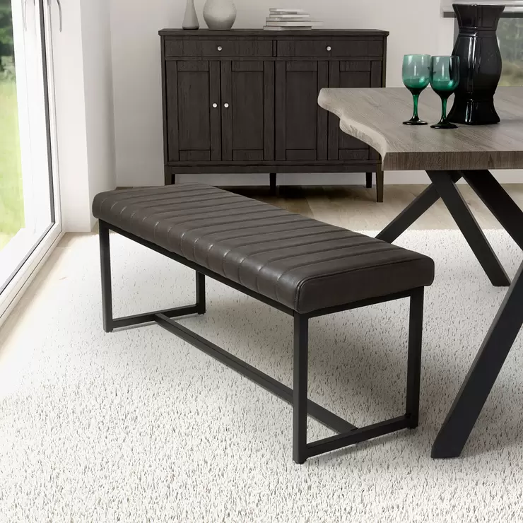 The Archer Dining Bench provides an industrial look and is a modern alternative to traditional dining chairs. Upholstered in a durable grey faux leather, the vertical stitching is complemented by black powder coated legs.