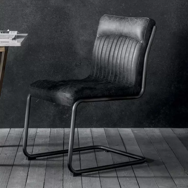 The Capri Cantilever Dining Chair by Gallery is upholstered in top grain leather in an antique ebony colour, complemented by the striking, vertical stitching. The cantilever frame is made from iron, ensuring stability and longevity for years of use in your dining room or office setting.
