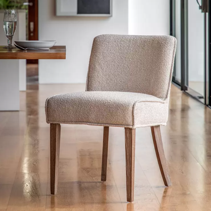 This set of 2 understated and chic dining chairs perfect for almost any interior and dining space. Upholstered in neutral taupe linen with gently curved legs.