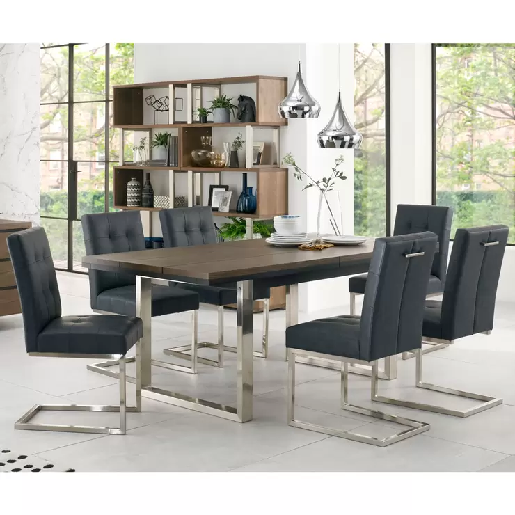 The Tivoli dining set from Bentley Designs is chic and on-trend, incorporating a bold and striking mix of dark oiled oak with ebonised accent detailing set off against a brushed satin nickel metal frame.