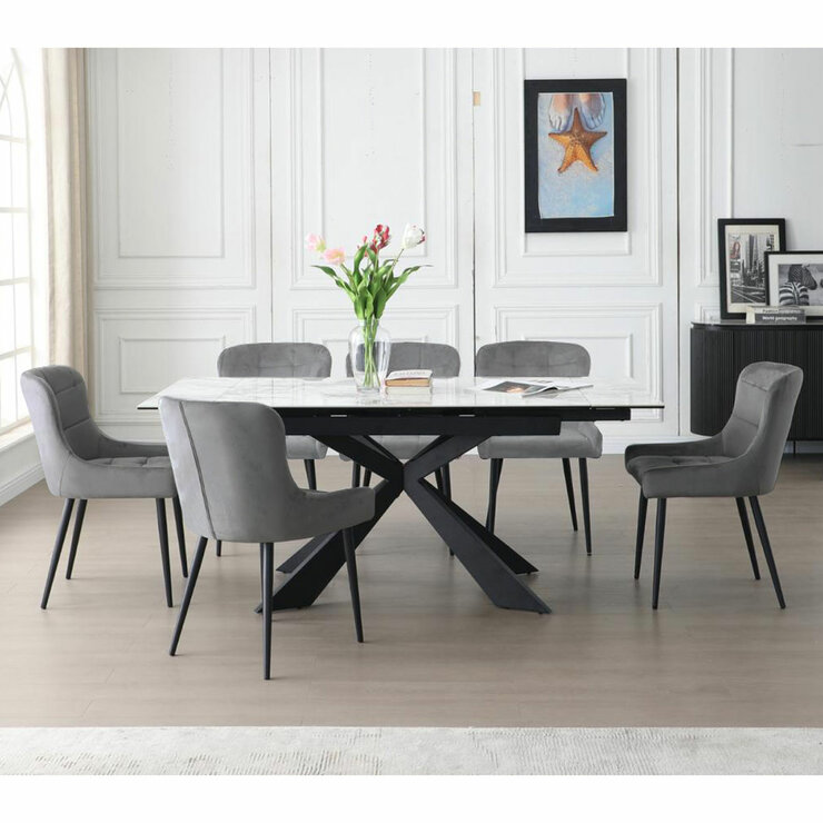 The Kia extending dining table features a ceramic and tempered glass top with a black iron base, combining modern style and durability. Its simple drop-leaf mechanism makes expanding effortless, and it pairs perfectly with black upholstered chairs for a sleek, industrial-chic dining set.