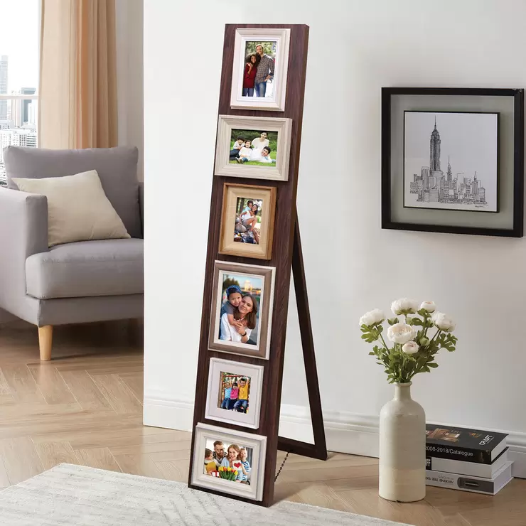 Treasure your special memories and create beautiful eye-catching photo displays easily with this sleek and stylish frame gallery. This versatile photo frame can stand gracefully on the floor or hang either vertically or horizontally to perfectly fit most any size wall. Display on your floor with the built-in full-size easel or alternatively hang it either vertically or horizontally - comes with pre-mounted hanging hardware. Includes wall anchors and screws for plasterboard (drywall) mounting.