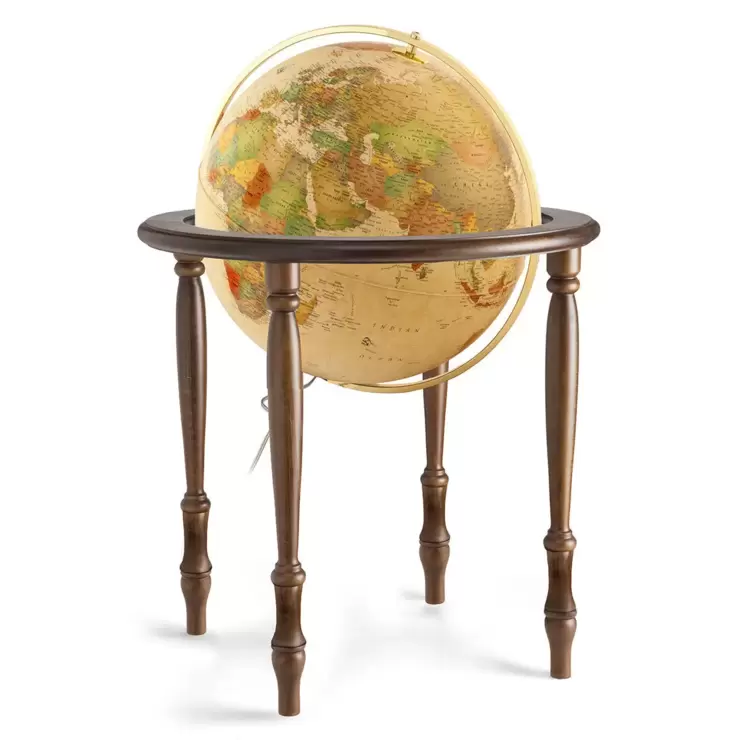The Nova Rico Cynthia Globe is a freestanding illuminated globe perfect for any Geographer's home, office or classroom. This stylish globe is made in an antique style, mounted on a carved hardwood base with attached wheels for easy movement. The Nova Rico Cynthia Globe is made with a classic design and has a solid brass meridian. A main feature of this globe is that is can illuminate. This illumination helps you to view the globe with ease and focus on the countries in more depth. This globe can also be used as a nightlight or lamp.