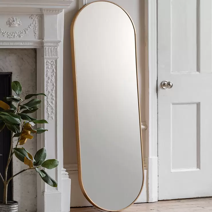 The Yardley Gold Leaner Mirror by Gallery features an oval-shaped glass mirror, with a gold finished iron metal frame. Great for opening up a room with its large size, it will make it appear bigger, reflecting more natural light indoors. Can be mounted onto the wall or used as a leaner mirror.