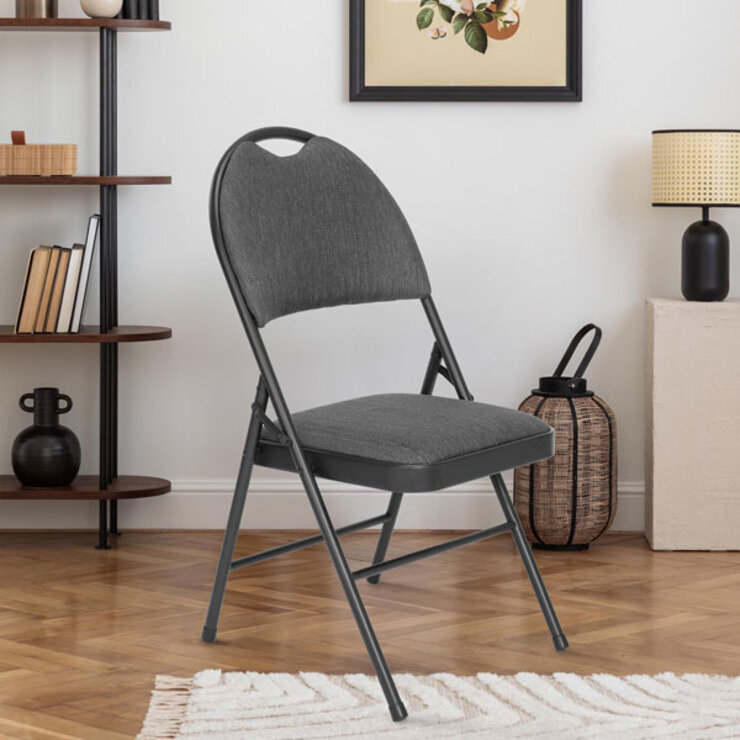 The Star Elite Padded Fabric Folding Chairs offer a compelling blend of comfort and convenience. These chairs feature a supportive high-back design and high-density comfort foam to keep you or your guests comfortable. The matte black frame pairs perfectly with the durable grey and black striped fabric. An ergonomic handle makes transport a breeze.