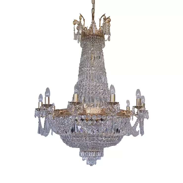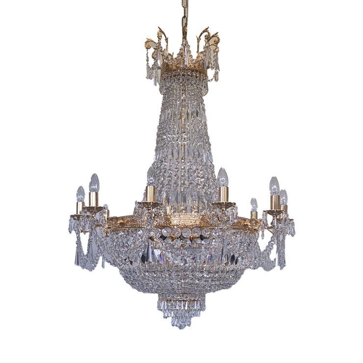 This exquisite Empire-style Chandelier is a true masterpiece of craftsmanship, featuring a stunning Gold-plated metal frame embellished with high-quality, precision-cut Crystals. The multi-tiered cascading Crystal design maximizes light reflection, creating a breathtaking display of brilliance.