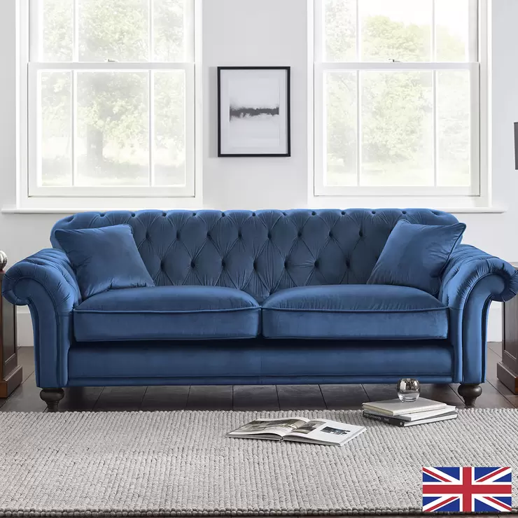 Bordeaux Button Back Blue Velvet 4 Seater Sofa