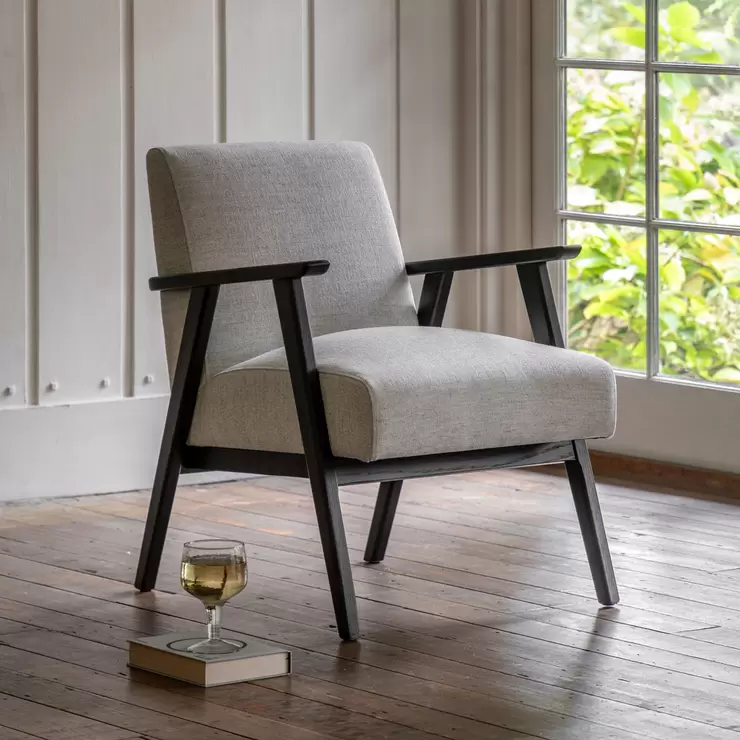 The Neyland Linen Armchair is a classic, mid-century inspired piece of furniture that will add a touch of sophistication to any room. This chair is finished in a striking black wood with simple and modern lines that contrasts the soft light grey linen seat.The frame and legs are made of solid wood, ensuring stability and longevity.