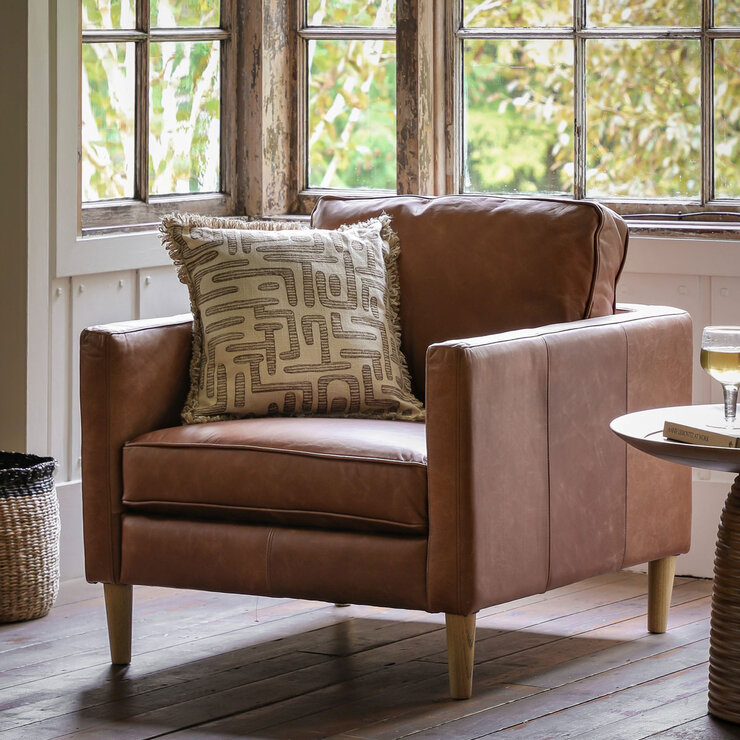 The Osbourne Brown Leather Armchair by Gallery is a stylish armchair that would suit a wide range of interiors with ease. It is upholstered in top grain full leather hide in a warm brown hue, which is complemented with the ash legs.