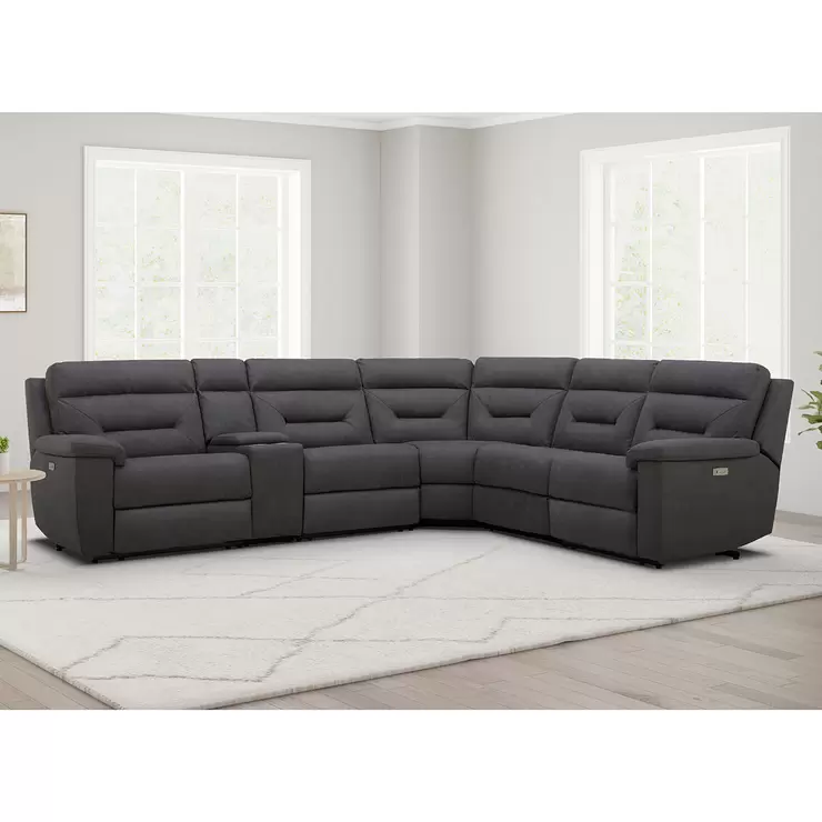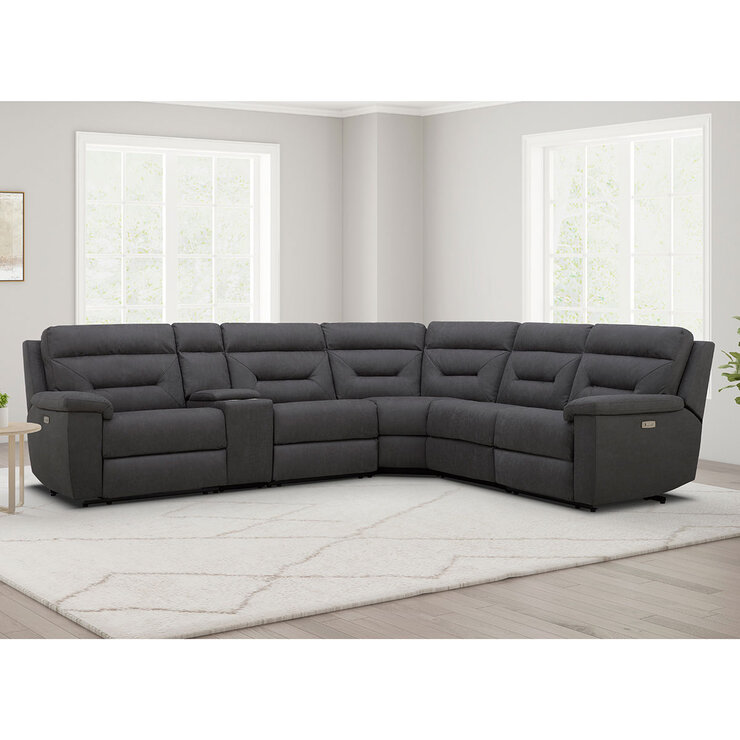 The entire family will enjoy the comfort and style of this Gilman Creek Justin Fabric Power Reclining Sectional Sofa. Featuring three power reclining seats, a storage console with cup holders and USB charging, this sectional sofa blends function, convenience, and comfort. The suede-like grey fabric is soft to the touch and cleans easily. This sofa is built to last using high-density foam cushions supported by sinuous springs, all on top of a solid wood and plywood frame.
