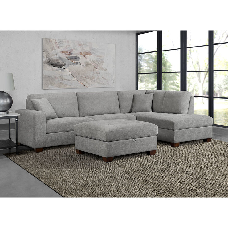 The Thomasville Miles Corner Sofa & Storage Ottoman adds style to your space and offers quality features in both fabric and construction. The sofa is covered in a soft to the touch fabric and is paired with two accent pillows. A subtle, yet stunning, tuft design is showcased on the seat cushions and ottoman to enhance the overall tailoring and style. The top of the ottoman pulls open to reveal a generous storage compartment. This storage feature allows for blankets, remotes, and more to be stashed out of sight, but still easy to access. Lastly, solid wood legs in a rich walnut brown finish complete the frame.