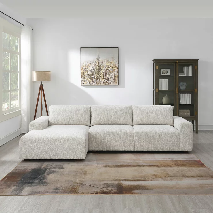 Unwind in style with the Zyllah Fabric Sectional with Reversible Back Cushions. Upholstered in luxurious boucle fabric in soft ivory and beige tones, it boasts sleek track arms, individually pocket coiled spring seat cushions, and sturdy solid wood legs. Combining classic design with superb comfort, it is the ideal spot for cosy evenings or cherished moments with loved ones - a timeless addition to any home.