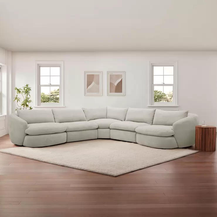 Discover the ultimate in comfort and contemporary style with Aiden & Ivy’s Holley 5-piece Modular Fabric Sectional. Holley's soft edges and rounded shapes offer a sophisticated yet inviting appeal. This modern design is upholstered in elegant bouclé fabric, a polyester material woven into a series of loops for a rich, textured look. The light, creamy fabric resists liquid spills and is easy to clean, making it as practical as it is beautiful. The sectional's end pieces feature rounded fronts and deep, generous seats, while the two armless sections can be rearranged to fit any room layout. Relax in luxury with the versatile and chic Holley sectional.