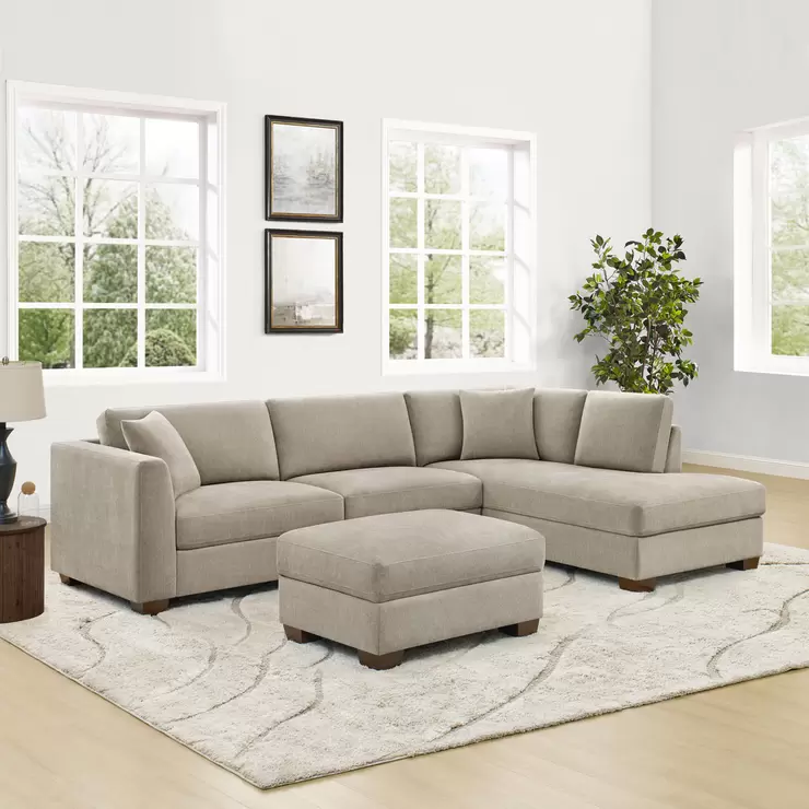 Elevate your living space with the Thomasville Walsen Fabric Corner Sofa with Storage Ottoman, where timeless design meets unparalleled comfort. Imagine sinking into the soft fabric, letting the firm yet inviting seat cushion support you after a long day. With a modern track arm and solid wood tapered legs, this sofa brings a sophisticated touch to any room. The spacious lounging chaise invites you to stretch out and relax, while the cleverly designed storage ottoman offers a perfect spot to tuck away blankets, magazines, or anything else that needs a home.