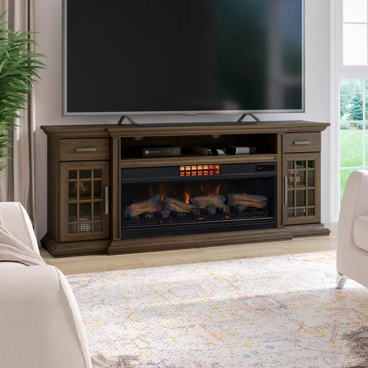 For a look that blends a warm Prairie Brown finishes with windowpane cabinet doors the Everett TV Console creates a sophisticated, yet welcoming atmosphere to your living space all year round. CoolGlow flame effect paired with the 2-in-1 heater and fan, this media mantel delivers year-round temperature control. The warmth of the infrared quartz electric fireplace keeps you cosy in the winter while the cool breeze of an oscillating fan is there for the summer when you need it most.