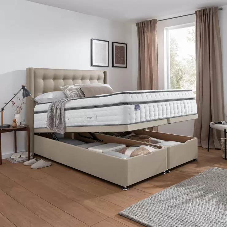 Silentnight Full Ottoman Divan Base with Bloomsbury Headboard in Sandstone in 3 Sizes