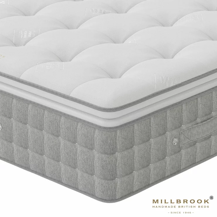 The Millbrook Natural Luxury 11000 Pillowtop mattress is a luxurious pillow top, redefining sleep with its sophisticated design and high-quality materials. Handcrafted in the UK, it combines advanced ErgoZone7 springs with plush natural fillings and Smooth-Tech™ inner tuft technology, providing unmatched comfort and robust support.