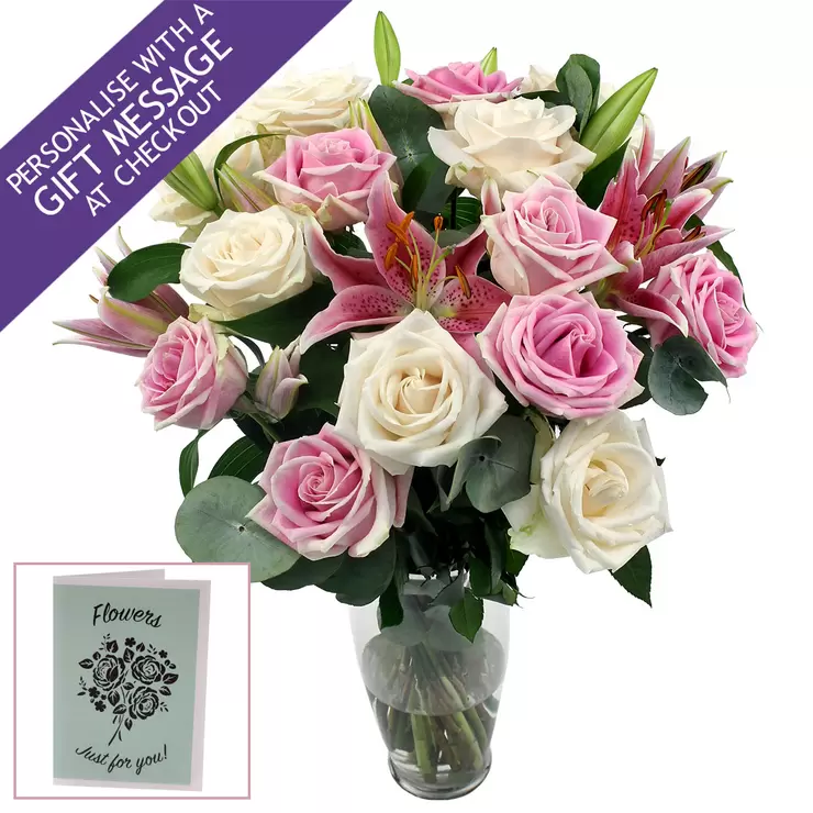 For the perfect gift for that special occasion, send this beautiful Colombian Roses & Oriental Dutch Lily flower bouquet. Among the different types of flower, roses are one of the most popular. This beautiful and bright mixed bouquet will make a lavish gift for loved ones, friends, or your home. It has 22 stems including 7 Pink Colombian Roses, 7 White Colombian Roses, 4 Pink Dutch Oriental Lilies, and 4 Natural Eucalyptus Stems. The luxurious arrangement of Colombian Vendela and Rosita Vendela Roses, complimented by pink Oriental Lilies and finished with eucalyptus foliage, makes a fantastic display for any room in the house.