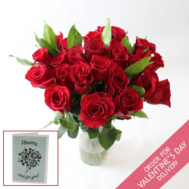 Valentine's 28 Stem Two Dozen Colombian Freedom Red Roses & Cocculus Bouquet with Greetings Card