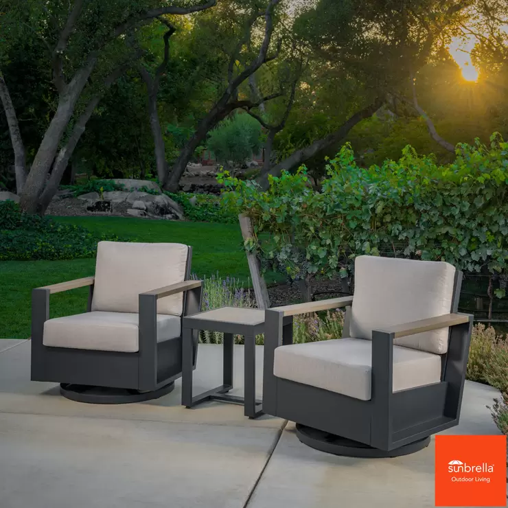 Discover the Archer 3-piece outdoor patio seating set from SunVilla, offering the perfect balance of modern style and unmatched comfort to transform your outdoor retreat. This set includes two beautifully crafted swivel glider lounge chairs and a stylish matching side table, perfect for creating an inviting spot for relaxation or casual conversation. The faux-wood table top and chair accents provide a contemporary look that feels like real wood.