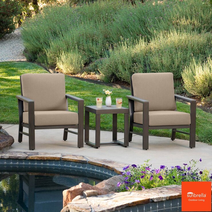 The plush cushions are upholstered in Sunbrella fabric, renowned for its resistance to stains, mildew, chlorine, and fading, ensuring the set remains vibrant and comfortable in any outdoor environment. Whether you're enjoying a quiet moment or hosting a guest, the Nichols 3-Piece Small Space Seating Set delivers lasting comfort and sophistication to your outdoor retreat.