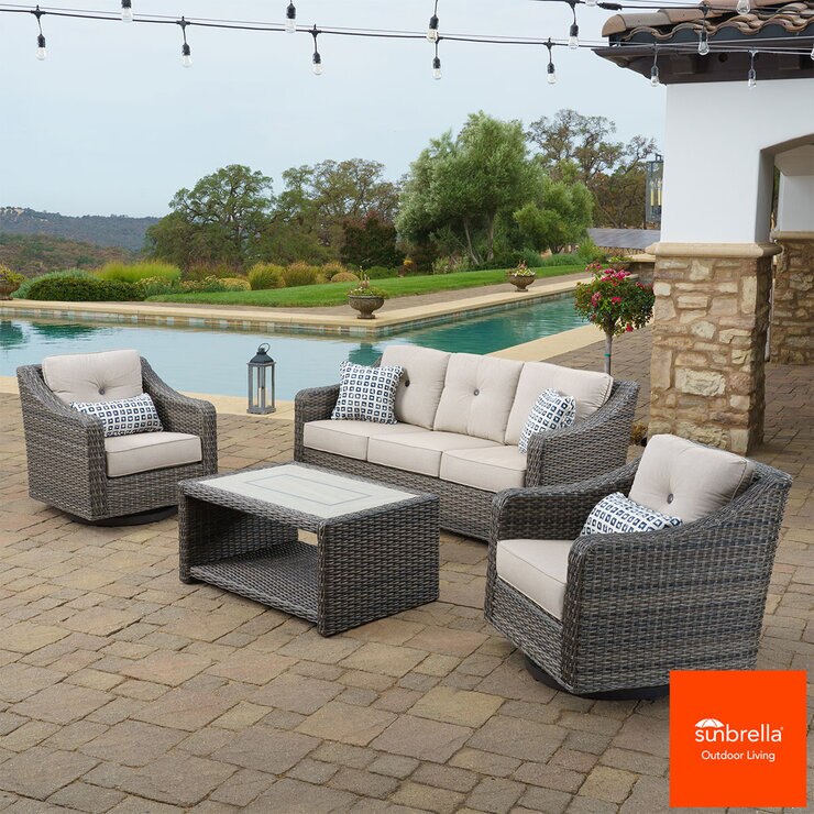 - 100% Sunbrella cushions and throw pillows that resist water, mildew, fading, and mildew