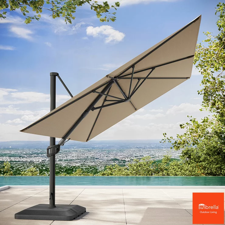 Featuring an easy-to-use sliding handle for opening, closing, and tilting the umbrella, along with a 360-degree crank for rotating the canopy and a highly durable resin base. Our large cantilever umbrellas are perfect for your garden, providing you and your guests with ample shade to relax comfortably outdoors, summer after summer.