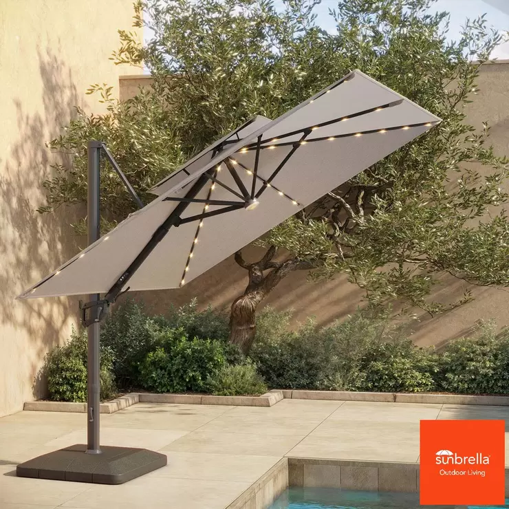 Seasons Sentry 10ft (3m) 2-Tier Solar LED Square Cantilever Umbrella with Base in Beige