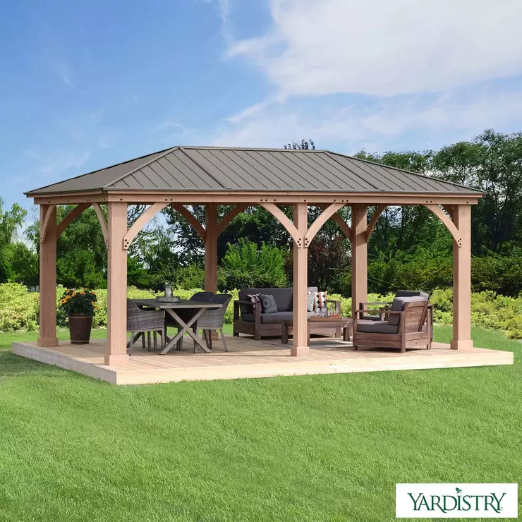 The spacious 12ft x 20ft Wood Gazebo is big enough to easily set up both a dining and living space! With its heavy duty corner posts and construction, this Yardistry Wooden Gazebo can be attached to any structurally safe surface (please note that anchoring hardware is not included).
