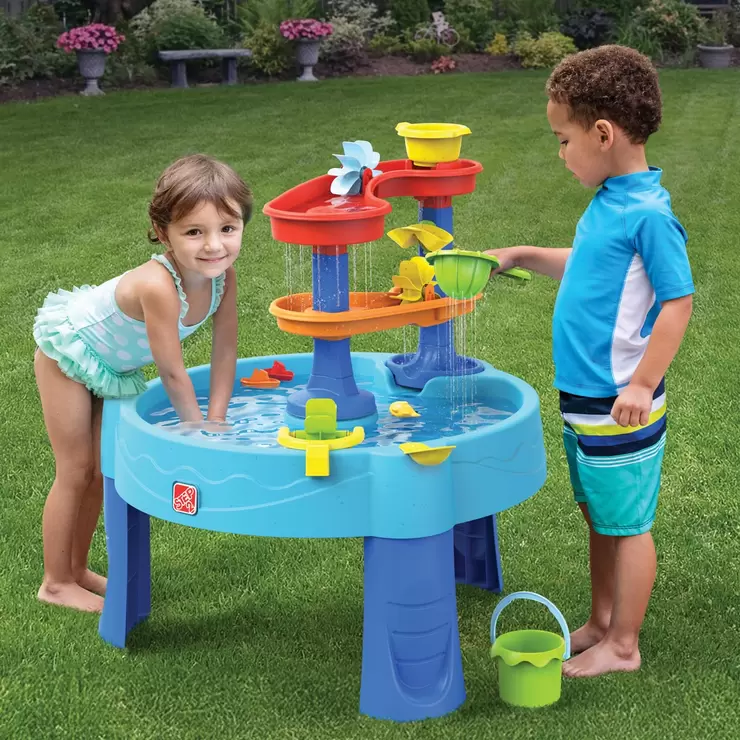 Get little ones engaged in splish-splashing fun with the Double Cascading Rapids Water Table™! Kids will love dumping water into the top tier, watching it cascade through water spinners and teeter totters, down through the middle tier, and into the basin below. Various activities and areas of play promote interaction and social fun for multiple toddlers. Accessories like play balls and sea critter toys engage fine motor skills as kids pinch, squeeze, and pass the toys around. This toy for toddlers has a durable, high-quality construction that can withstand years of playtime fun and is easy to clean.