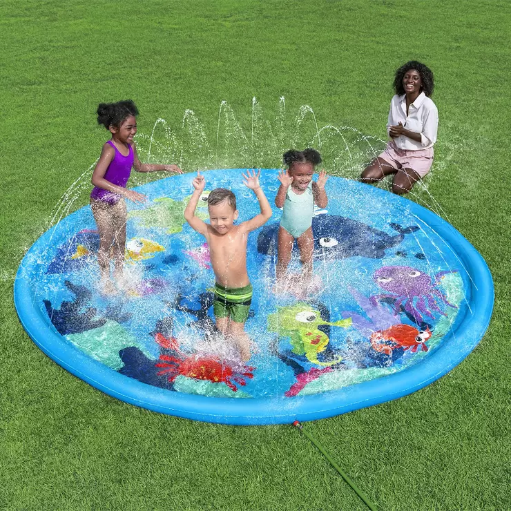 The H2OGO!® Underwater Adventure Sprinkler Pad is redefining backyard fun. Big and little kids alike will love the shallow splash pool created with the inflatable rim that surrounds the pad and traps the water for endless, splashing fun. Get ready to dance beneath a cascade of cool water! Just hook up your garden hose to create the gentle streams that will not only inspire play and imagination but keep everyone cool under the warm summer sun. Kids can jump, splash or wade in the water. Kids will be captivated by the friendly ocean themed graphics and parents will enjoy the easy set-up and safe water play. Everyone will find something to enjoy with Underwater Adventure Sprinkler Pad.