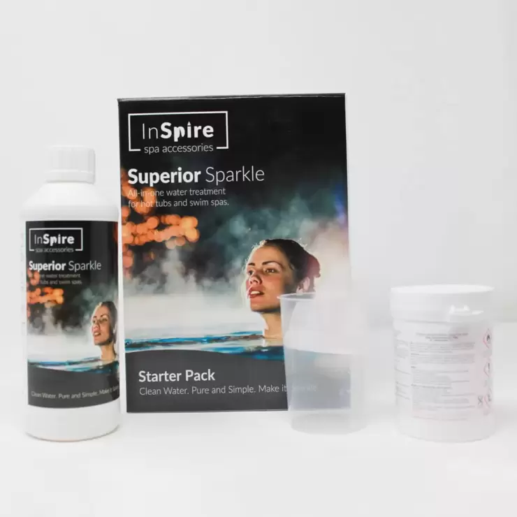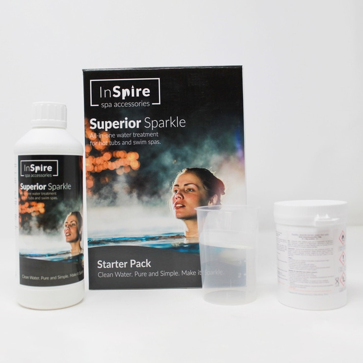 InSpire Superior Sparkle Chemical Starter Kit can be used in your spa or hot tub. Superior Sparkle will help you to keep the water in your spa clean in a safe, simple and effective way. With only one weekly treatment, Superior Sparkle will help you to prevent calcium deposits in your system. Superior Sparkle Chemical Kit will loosen and remove the existing calcium deposits, these calcium deposits are the medium where bacteria and other micro-organisms grow. The ozone- or UV-system already in your spa, will do the rest. The Superior Sparkle Kit will destroy the bacteria and disinfect the water. The water in your spa is not only clean, but also looks crystal clear and feels nice and soft.