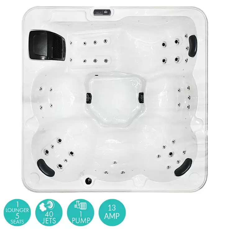 The Hot Tub Master Luna Stream hot tub has 40 hydrotherapy jets generously placed in the hot tub seats, allowing each user to experience an entirely different massage sensation. As well as jets for the back and legs, there are also 2 more foot massage jets at the end of the long comfortable lounger seat. 16 colour changing LED lights further enhance to relaxation possibilities of this superb 1 lounger, 5 seats, 13Amp hot tub. Designed with high density polyurethane foam sprayed on the tub shell, and an ABS tub base, providing the best insulation.