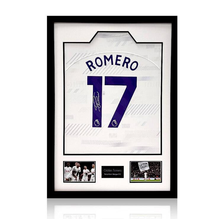 Cristian Romero signed framed Tottenham Hotspur shirt, including 2 photos. This is an official Tottenham Hotspur shirt, which was personally signed by Cristian Romero, at a private signing session with The Fan Cave Memorabilia.