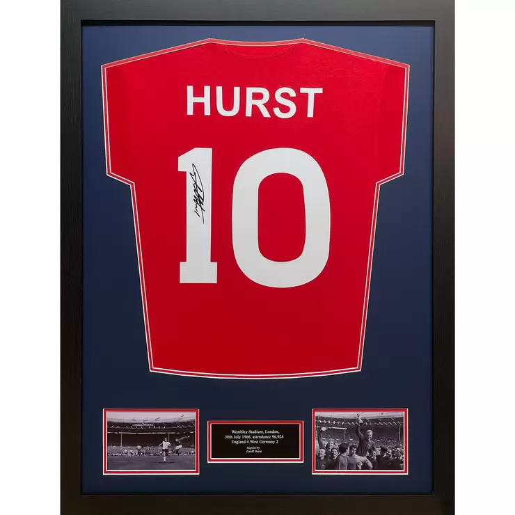 This is a replica football shirt personally signed by Hero of the day Sir Geoff Hurst on 6th May 2022 at a private signing session carried out and attended by Allstarsignings. Professionally framed to an overall size of 80 x 60 cm.